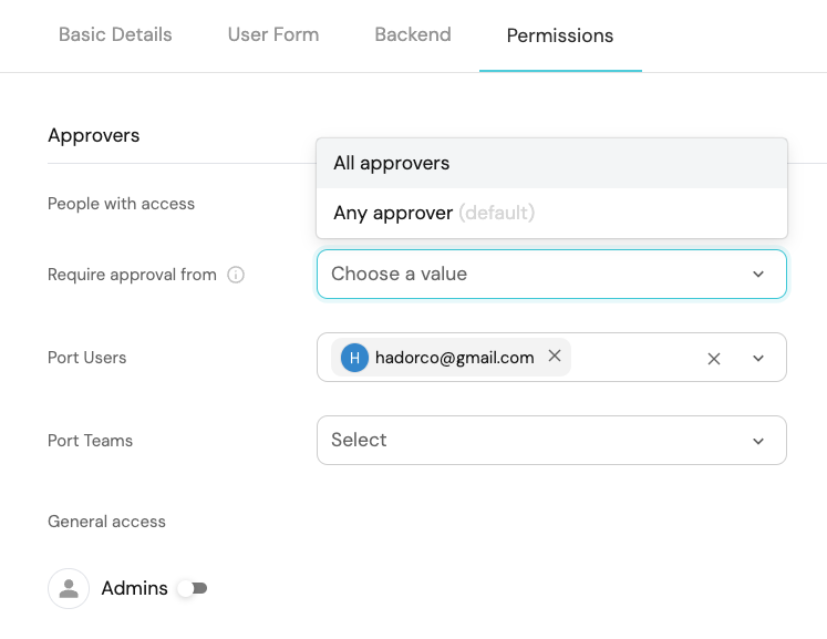 option, you can add approvers by selecting them from the relevant dropdown menu (Port Users