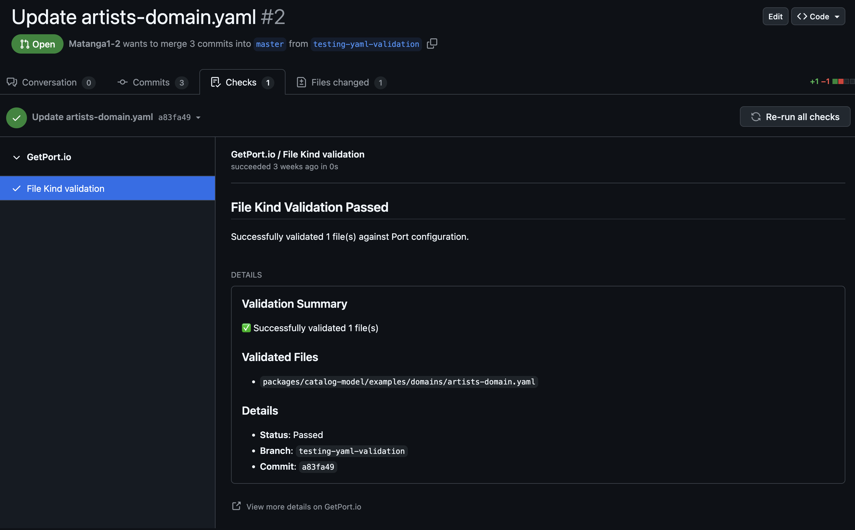 When a PR modifies a matching file, you will see a new check in your PR with the validation results.