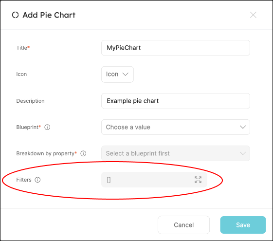 Pie charts, number charts and tables support filters, which allow you to include or exclude specific data from them. The filters are based on Port's Search Rules, and are set when creating the widget: