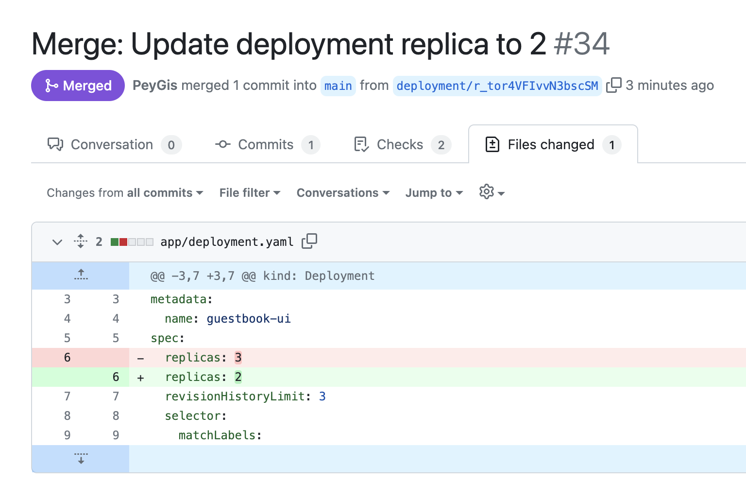 In this guide, we will create a self-service action in Port that executes a GitHub workflow to change the number of replica counts in a kubernetes deployment. The workflow involves updating the deployment manifest with the new replica count(s) and creating a Github pull request (PR) for it. The workflow can optionally merge the PR when enabled.