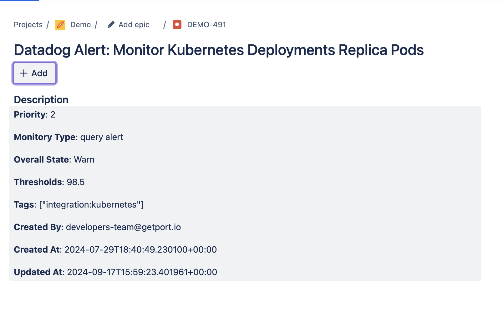 This guide demonstrates how to implement an automated process in Port that creates a Jira issue from a Datadog alert.