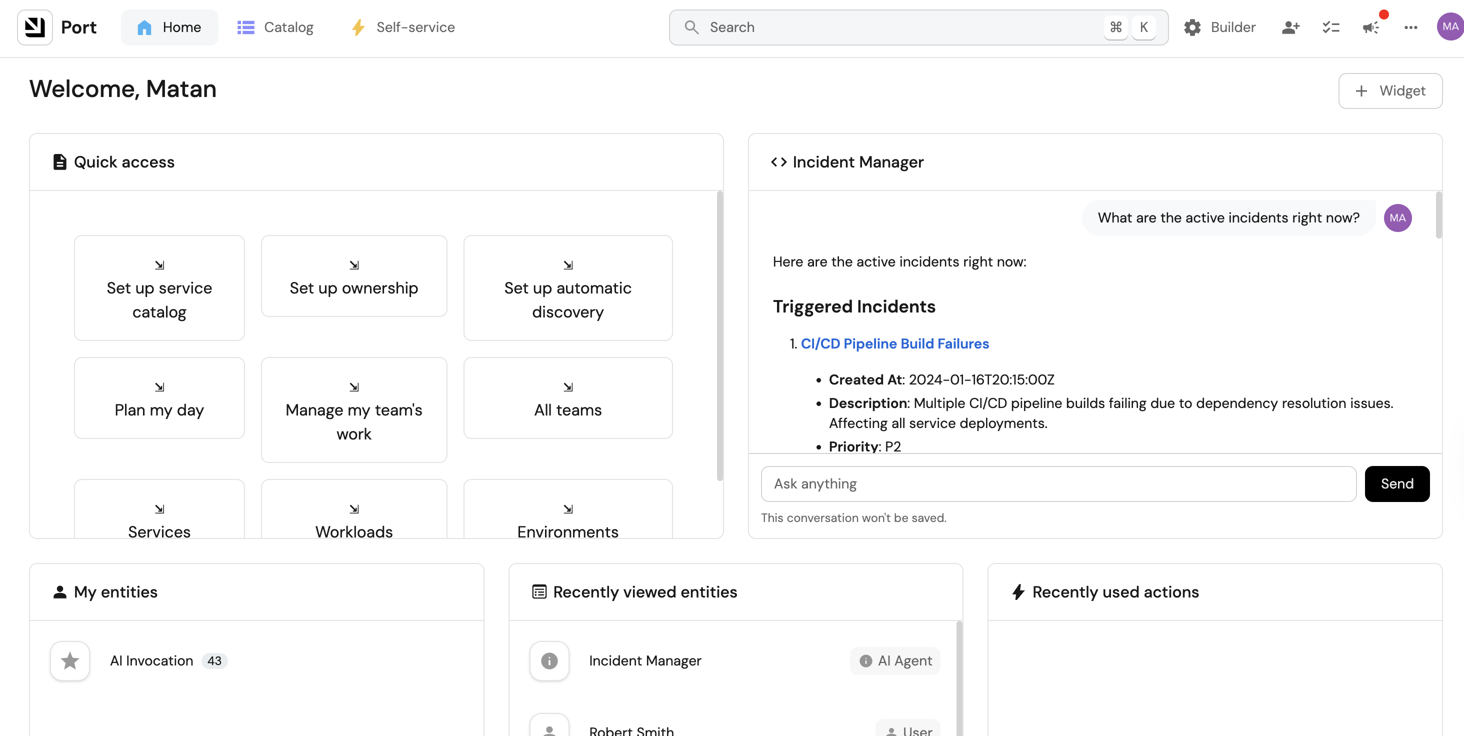 The Incident Manager AI agent can be accessed through an AI Agent widget in your Port dashboard.