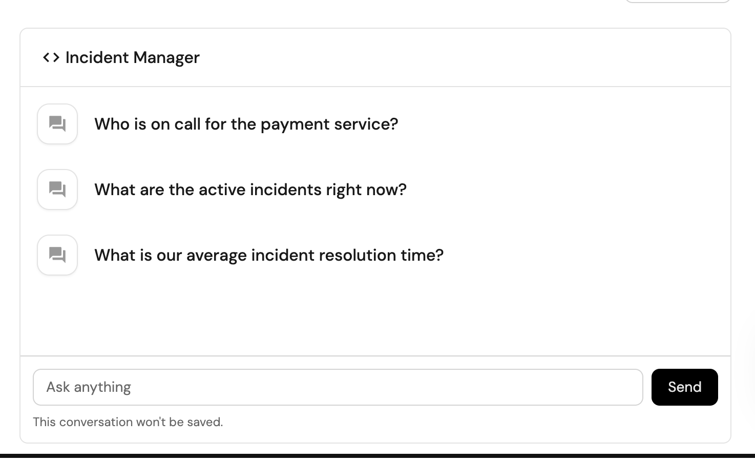 - The data sources it will use to answer questions about incidents and on-call rotations.
